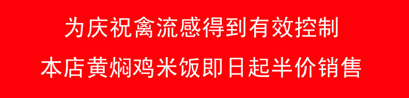 大富源餐飲有限公司潤仟祥黃焖雞米飯的加盟商,爲瞭(le)慶祝禽流感得到很好的控制,總部要求各加盟商在5月25号到5月28号期間搞半價促銷活動。總部會給與各加盟店相關的政策支持,及一定比例的經濟補(bǔ)貼。望廣大加盟商積極響應,詳情咨詢總部耿經理。