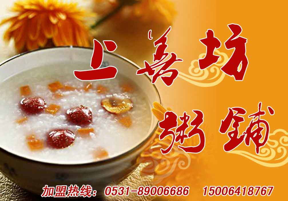 品種多樣:“上善坊” 粥種類繁多,有百合南瓜粥;皮蛋瘦肉粥;香芋粥;雜糧粥;冰糖雪耳粥; 瑤柱粥;生滾魚片粥;生滾蝦仁粥;生滾豬肝粥;生滾豬腰粥;生滾田雞粥;八寶粥;山*糯米粥;生滾鹹雞粥;生滾牛肉粥;冰糖燕窩粥;瑤柱魚翅粥;奶香燕麥粥;蘋果小米粥;麥片粥;桂圓蓮子粥;冰糖菊花粥;土豆肉末粥……,光是這些名字,就足以讓人感到溫暖甜蜜。在咧咧寒冬,一碗熱粥暖人心脾,一年四季無淡季。還有鍋貼、油餅等諸多早點技術與各種粥合理搭配,深受消費者喜愛。