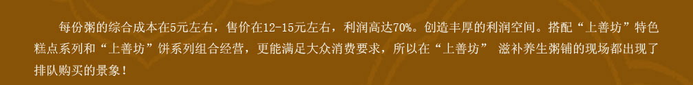 2、不需要特别經驗,上手快,易於經營打理。綜合研究以上這些成功的特征,所有的結果指向瞭健康食品—“上善坊” **粥。